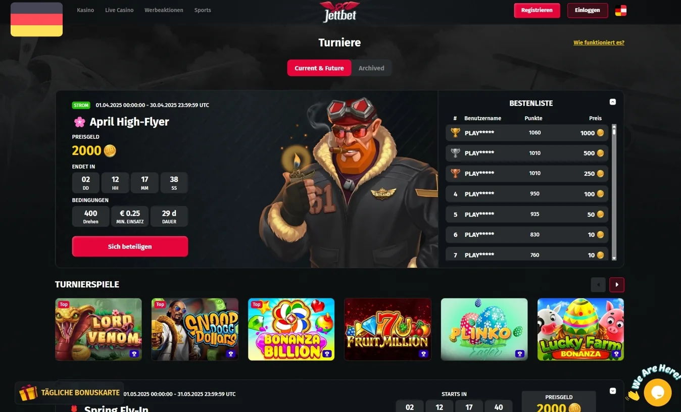 Unsere Plattform kombiniert eine benutzerfreundliche Oberfläche, schnelle Auszahlungen, großzügige Casino Boni und 24/7-Kundensupport. Ob Sie Spielautomaten, Live Casino, Tischspiele oder Sportwetten bevorzugen – JettBet ist Ihr Tor zu den besten Casino Spielen und Echtgeld-Gewinnen. Starten Sie jetzt auf jettbet.com und entdecken Sie ein Online Casino Deutschland, das Ihre Erwartungen übertrifft!